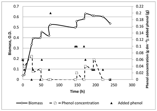 Two separate control experiments were carried out. The results for one of them are shown in Figure 1. Although the microbial growth curves were somewhat different, the total amounts of digested phenol were similar (0.93 and 0.86 g), i.e., 0.9 g in average; cf. Table 1.