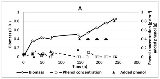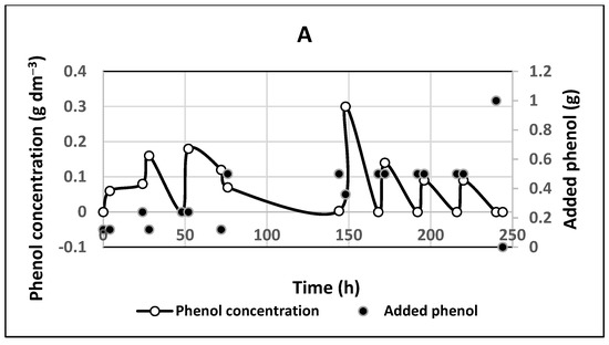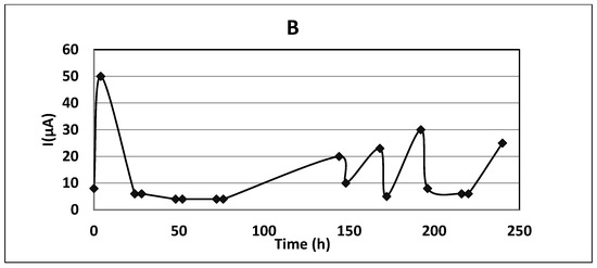 The monitored current values were microamperes of orders of magnitude (Figure 3B), too low to expect electrochemical input for the total biodegradation process. Calculations using Faraday’s law (cf. Equation (1)) for the measured electric currents yielded about 1 mg degraded phenol for 240 h run, whereas the degraded amounts were 4.24 and 6.56 g phenol at free and immobilized cultures, respectively. Similar effects were observed for phenol biodegradation by P. putida [11].