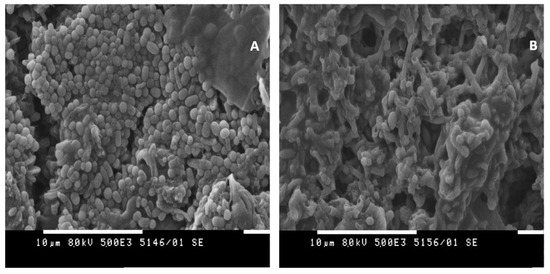 Relatively intact morphological characteristics, shape, and size of the strain were observed in the control sample (Figure 3A). The trend indicated ubiquitous morphological damage to the cells in the sample treated by an electric field (Figure 3B). Cell surface indentations recorded in more than one area were reported, but the observed phenomenon was not ubiquitous. In some areas of the cell population, some cells emptied of cell contents were observed. As a result of longer treatment, the strain was likely to synthesize an exopolysaccharide in response to stressful conditions.