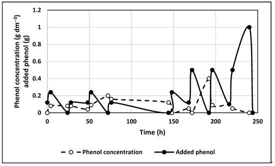 The fermentation media were identical to the one for strain cultivation, i.e., MMY, cf. Section 2.1. These media differed by the initially added amount of phenol. During the runs, phenol was introduced into the broth in a fed-batch mode when it was already exhausted. The total amount of degraded phenol for each run was considered as a reference for the process efficiency of the run.