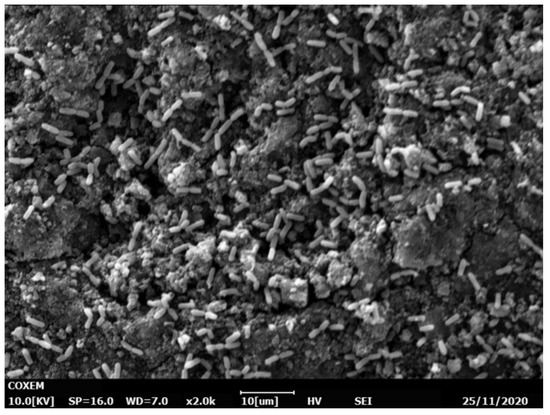 This effect could be due to the abiotic physical adsorption present in all cases (with and without application of electric field) because of the accumulation of cells on the surface of the carrier, as well as the penetration of cells below the exposed surface of the carrier. As a result, the direct influence on all cells of the strain was limited, and accordingly, there was limited influence from the electric field. The local immobilization of microbial cells was proven by SEM after 240 h of phenol degradation. A significant amount of intact cells was observed on the carbon surface (Figure 5).