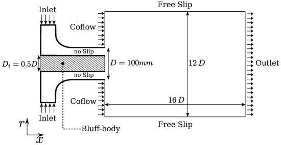 Here, represents a balance of the product of the axial and tangential momentum of the flow and the axial momentum . Turbulent variables k() and () are defined in the inlet through a fixed-value condition. Although the initial value set for both k and is very low (, it does not affect the numerical solution as the correct amount of turbulence is developed through the simplified inlet duct []. For the co-flow, the velocity is defined through a Dirichlet type boundary condition (B-C), providing a fixed velocity value that is normal to the boundary. For the inlet duct walls, no-slip conditions are applied, making in the walls. Turbulence variables k and are defined in this zone through standard wall functions. The other walls of the domain (discharge zone) are defined with a free-slip condition. For the outlet, a zero-gradient boundary condition is applied to the velocity and turbulence variables. The pressure in the outlet is defined through a fixed-value B-C, with