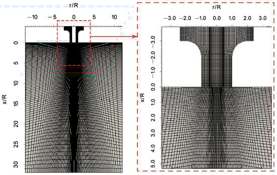 Two structured grids (one coarse and one fine) were used in the present work. Figure 2 presents general and detailed views of the coarse grid. In both grids the elements are radially and axially concentrated around the jet discharge zone. A positive grow factor was implemented from this point towards the radial boundaries and the outlet. At the inlet duct, the size of the first element from the wall was adjusted to maintain , which represents the upper limit of operation for the use of wall functions. However, no explicit refinement is performed in these zones. Both grids are much coarser than the one used by García-Villalba et al. [], having from 22 to 6 times less elements. The distribution of the elements in each direction (axial, transversal and radial) for each discretization is presented in Table 1.