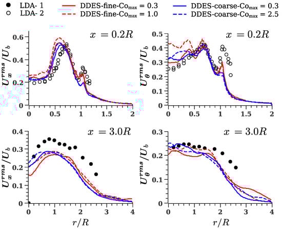 The main characteristics of the study cases are presented in Table 2. For each grid, DES, DDES and SAS turbulence models are used, all of them based on the SST model. In each case, the swirl number in the jet discharge was calculated using Equation (18) with the sampling data of axial and tangential velocity in the jet discharge zone . The calculated value was calibrated to by varying the tangential velocity at the inlet diffuser boundary. It was found that in order to keep within the allowed range, different values of tangential velocity had to be set in the inlet boundary for each grid and turbulence model configuration. The time-step was set in terms of the Courant number due to stability concerns in the solution. Although the backward scheme used for the time interpolation is implicit, its boundedness is not guaranteed and unphysical oscillations may appear in the domain []. Preliminary runs were performed to establish the effects of varying the maximum Courant number (), which are presented in Figure 3. These results are obtained by adjusting the PIMPLE algorithm to calculate the turbulent properties in each outer loop (pressure-momentum coupling). The use of this setting prevents the calculation of the turbulence fields from being postponed until the last iteration, which would cause an artificially large increase of the simulated rms velocity values, depending on higher values for . In Figure 3 it is detected that the increase of generates stronger fluctuations in the axial jet discharge zone (), especially in the inner recirculation radial zone (). These effects can be explained by a high sensitivity of on rms velocity as a function of grid resolution, which are comparatively attenuated when using a coarser grid. At lower axial positions (e.g., ), most of these artificial fluctuations dissipate quickly, resulting in small differences between the presented values. Further increases in values led to much stronger fluctuations at the jet discharge and excessive dissipation downstream. Comparable results are reported by Kalaushina et al. [] in a LES simulation of a round jet. According to this analysis, the maximum values allowed in the present study are established for the coarse-grid () and fine-grid () cases, which allow simulations to be run in appropriate ranges simultaneously for accuracy, numerical stability and speed of solution, as presented in Section 5.