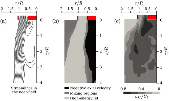 Description of the flow in the near-field of the jet using mean velocity data from case 1c: (a) Streamlines of and . (b) Regions of the flow based on the bulk velocity. In black: negative velocity zone with . In dark gray: inner and outer mixing regions with . Light gray: high energy jet, with . (c) Standard deviation of the velocity magnitude .