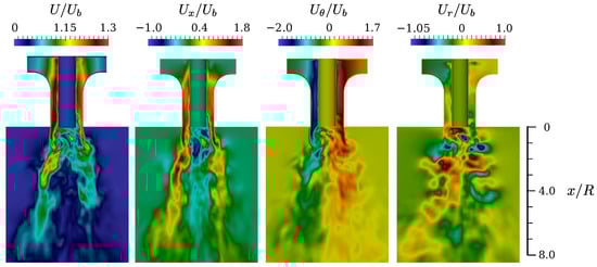 - For the radial velocity contours (), an alternating behavior of is detected. While little variation on this velocity component is observed inside the inlet diffuser, an alternating pattern in is quickly developed just in the very near-field ().