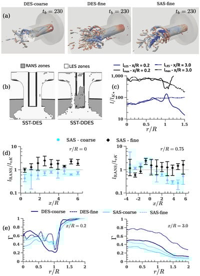 (a) Coherent structures in the near-field of the jet (contours with ) for cases 1c, 1f and 3f taken at . (b) Zonal treatment (RANS / LES) for cases 1c (DES) and 2c (DDES) at . (c) Radial profiles of the ratios of the resolved and maximum length scales to the pseudo-Kolmogorov length-scale for the case 1f (DES). (d) Axial profiles of the interval-mean ratio of length scales for SAS-bases cases (3c and 3f). The error bars represent the maximum and minimum interval values. (e) Radial profiles of the ratio of resolved to modeled turbulent kinetic energy for DES and SAS cases.
