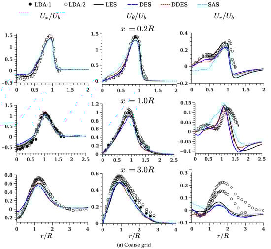 In spray drying, the airflow pattern in the chamber mainly determines the movement and transport of droplets []. As the initial droplet-gas contact occurs in the near-field region of the jet, an accurate prediction of mean velocity profiles of the gas phase in this location is essential. Figure 7a,b present the radial profiles of the mean velocity components at three different axial positions downstream the annular inlet region using the DES, DDES and SAS models, with coarse and fine grids. Overall, the DES, DDES and SAS results agree well with LES and experimental data. For the axial velocity , evident differences are observed downstream the inlet ( in zones of negative axial velocity (recirculation zones), where SAS and DDES produce better results than DES. This occurs in both coarse and fine grids, although smaller differences with LES data exist when the fine grid is used. The better accuracy of the SAS model over the DES in zones with recirculation has been previously reported by Zheng et al. []. The improvement of DDES over DES in this zone is related to the treatment that DDES gives to the cells close to walls boundaries, which was presented in Figure 6b. This results in a better representation of the inner recirculation zone. Other differences in the results of the axial velocity are seen in the jet decay, specially at . In this location, for both grids and using the DES model, the jet shape is more flattened than using DDES or SAS.