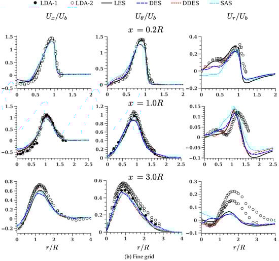 For the tangential velocity , the differences between the models are very small and only noticeable in the inner shear layer near the inlet (, ), where DDES and SAS produce inferior results than DES. This difference is smaller if the fine grid is used. For the radial velocity , in the very near field ( and for both grids, DES and DDES curves match closely with LES data, while the SAS results differ significantly. At , large differences between experimental data and all CFD results are detected. Although the presence of experimental errors in this location measurements is not discarded [], DES, DDES and to a lesser degree SAS results at closely follow the LES trend.
