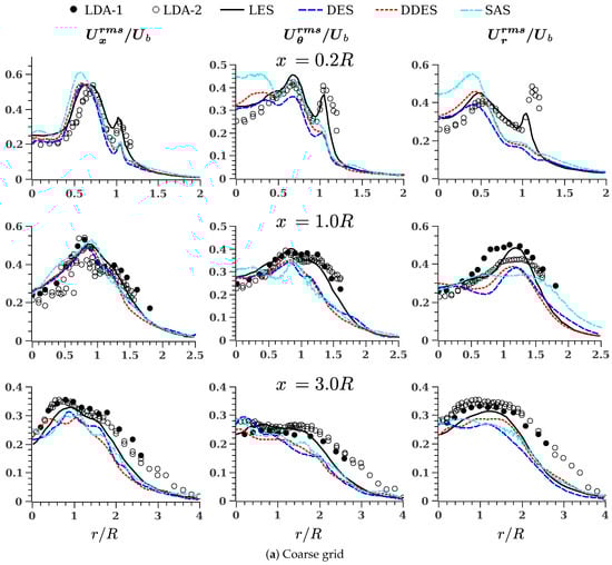 Figure 8a,b presents the radial profiles of rms fluctuations of velocity components () for the same study case and using the coarse and fine grids. The rms value gives a good indication of the unsteady behavior of the jet. It is crucial in spray drying as it governs the turbulent dispersion of droplets. Overall, for the axial and tangential velocities (, DES, DDES and SAS data trends are similar to LES and LDA, especially in lower axial positions ( where all the three models perform remarkably well for both grids. Significant differences with LES and LDA data are observed mainly in two zones. First, in the very near-field of the jet, at , for all turbulence models, the fine grid overpredicts the rms values in the inner recirculation region ( to ). In this zone the coarse grid brings better results for DES and DDES. For the SAS model, both grid sizes overpredict in a similar way the rms values. Second, in the outer shear layer located at and , DES, DDES and SAS do not reproduce well the narrow peak shown by the LDA and LES data, especially if the coarse grid is used. This is explained in the decrease of the resolved fraction of turbulent kinetic energy due to the coarseness of the grids, as presented in Figure 6e.