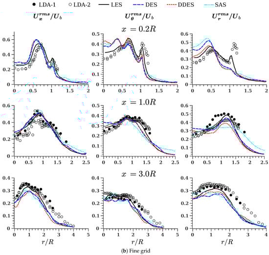 Radial profiles of rms fluctuations for velocity components () at different axial positions (x/R = 0.2, 1.0 and 3.0) taken from to using the coarse (a) and fine (b) grids. rms values are normalized by the bulk velocity . Left column: axial component ; center: tangential component ; right: radial component . Blue, red and cyan lines represent DES, DDES and SAS simulation data; open symbols: experimental data from []; closed symbols: experimental data from []; solid black line: LES data from [].
