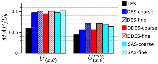 Mean absolute error (MAE) of the mean velocities and the rms fluctuations for the different computational cases studied. The black bar represents LES data []. Blue, red and cyan bars represent DES, DDES and SAS simulation data. The fill style defines the type of grid used: the solid fill for the coarse grid and the diagonal-cross fill for the fine grid.