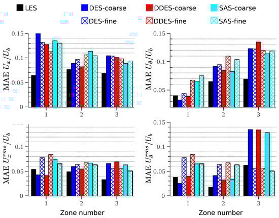 Mean absolute error MAE of the mean and rms fluctuations for velocity components () for three different radial zones (1,2,3). Zone 1: Axial recirculation zone. Zone 2: Internal jet, from to . Zone 3: External jet, from to the maximum measured radial position. Bars represent CFD simulation data. Black bar: LES data from []; blue, red and cyan bars represent DES, DDES and SAS simulation data, respectively. The solid fill corresponds to a coarse grid and the diagonal-cross fill to a fine grid.