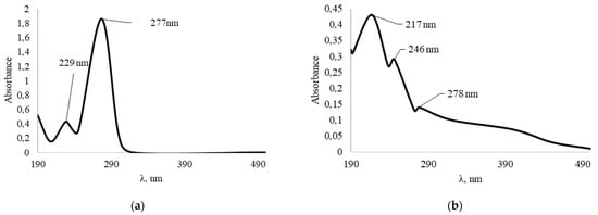 UV spectra of 1,3,5-trihydroxybenzene: (a) initial; (b) after interaction with NaOH at a temperature of 70 °C and holding for 24 h.
