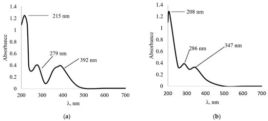 The UV spectrum of the first solution (Figure 5a), where the addition of the condensing agent was instantaneous, shows absorption maxima at 215 and 279 nm, which are characteristic of 2-furylmethyl alcohol and 2-furaldehyde, respectively. This suggests that the condensing agent did not fully enter into the condensation reaction with 1,3,5-trihydroxybenzene, and began to partially disproportionate with the formation of 2-furyl methyl alcohol. Additionally, on the UV spectrum, there is no absorption maximum characteristic of 2-furancarboxylic acid. This suggests that 2-furancarboxylic acid reacted with 1,3,5-trihydroxybenzene.