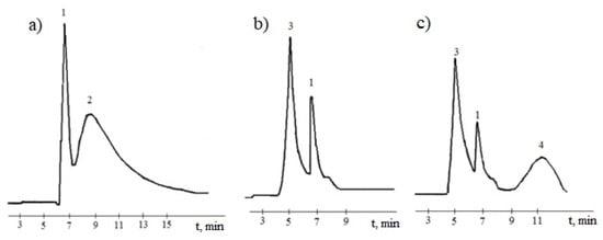 Figure 9 shows a liquid chromatogram of a mixture of 1,3,5-trioxybenzene and 2-furaldehyde in water (Figure 9a), as well as a liquid chromatogram of the products obtained by condensation interaction of 1,3,5-trioxybenzene with 2-furaldehyde in an alkaline medium (Figure 9b). HPLC analysis showed that the peak at 7 min corresponds to the yield of 1,3,5-trioxybenzene and the peak at 9 min corresponds to the yield of 2-furaldehyde (Figure 9a). The area of the peaks was used to calculate the relative concentration of 1,3,5-trioxybenzene and 2-furaldehyde at different time stages of the reaction. The chromatograms show that at the beginning of the co-condensation reaction of 1,3,5-trioxybenzene with 2-furaldehyde in an alkaline medium, their mono derivatives are formed (peak 3 in Figure 9b). After 40–50 min (Figure 9c), a further change in the molecular structure occurs, as evidenced by a decrease in peak 3 (mono derivatives) and peak 1 (the remaining 1,3,5-trioxybenzene) and the appearance of peak 4 at 11 min, corresponding to oligomeric molecules, which are better adsorbed on this sorbent and, therefore, leave the column later.