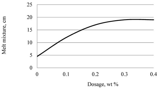Analysis of the data presented in Figure 13 showed that the diameter of the spreading of the cement paste of the unplasticized system (without the addition of a plasticizing additive) is 4.5 cm. In the presence of the additive, a significant dilution of the cement paste is observed. An increase in the spreading diameter of the mini-cone of the plasticized system of up to 19 cm determines the value of the plasticizing ability of the synthesized oligomer. The minimum dosage of 1,3,5-trihydroxybenzene-2-furaldehyde at which the maximum plasticizing effect is achieved is 0.3% of the cement mass, which characterizes the plasticizing activity of the additive. Thus, the optimal dosage of the developed plasticizing additive is 0.3% of the cement weight (calculated on dry matter).