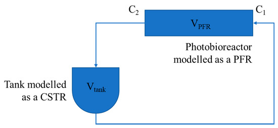 The model considers the photobioreactor as a plug-flow reactor (PFR), which has an outlet section that discharges water into the feed tank where from the latter is pumped back to the inlet section. The feed tank is well mixed and was modeled as a continuous, stirred-tank reactor (CSTR), while the recirculation piping volume, and that of the centrifugal pump itself, was deemed negligible. Therefore, separate models were written for the photobioreactor and for the feed tank to relate the relevant inlet and outlet oxygen concentrations and considering their holdup volumes and the circulating feed flow rate. In this model, represents the inlet concentration to the photobioreactor as well as the uniform concentration of the tank, that is, the measured quantity. Then, these models were coupled by considering that the inlet stream to the PFR was the outlet stream from the CSTR and vice versa, thus obtaining the overall model, where the feed tank concentration was expressed as a function of three characteristic times, namely, the residence time in the PFR (), the residence time in the CSTR (), and the mass transfer characteristic time (), which is the inverse of the mass transfer coefficient (), the quantity that should be determined.