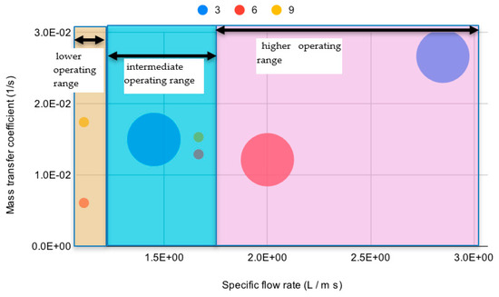 Figure 4 shows the dependence of the mass transfer coefficient on the specific flow rate on the cascade, highlighting both the dependence on inclination and on the unit size. Indeed, most measured coefficients range from 0.01 to 0.02 s−1, with only one operating condition producing a coefficient below 0.01, and one larger than 0.02 s−1. At a closer look into Figure 4 it can be observed that the plot can be divided in three sections, defined by the specific flow rate adopted: the lower operating range, where the mass transfer coefficient appears to depend on the installation inclination, the intermediate range, where the mass transfer coefficient appears scarcely sensitive to changes of inclination, and even of flow rate itself, and the higher range, where the highest mass transfer coefficient is obtained at the lowest inclination.