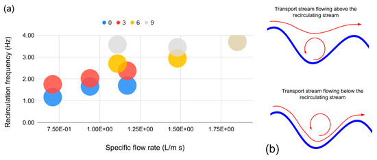 (a) Relation between the specific flow rate and the measured recirculation frequency measured in the smaller test unit; (b) relative position of the recirculation and transport stream in each photobioreactor cavity.