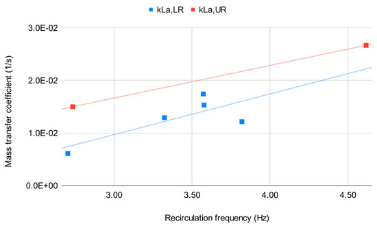 Indeed, the relationship between mass transfer coefficients at 6° and 9° can be very well observed and is shown in Figure 6. The change in installation angle and specific operating flow rate is reflected by the recirculation frequency, and this latter translates into a proportionate change of the mass transfer coefficient.