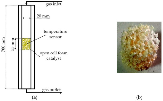 The catalyst was a complex composite material prepared in several stages. The basis of the material was made of nickel open-cell foam. An alumina layer was applied on top of the nickel, and palladium was deposited on the alumina layer. A detailed description of the preparation of the catalyst material is presented in [41,42]. The catalyst was tested in an isothermal cylindrical reactor. The reactor constituted of a hollow steel tube of an inner diameter of 20 mm, and a sample of a foam catalyst was 55 mm in length (Figure 1).