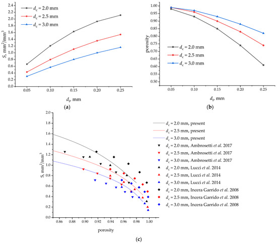 The parameters of the constructed models of open-cell foam structure: (a) Surface area referred to the occupied volume (m2/m3). (b) Porosity. (c) Comparison with literature results [44,47,48].