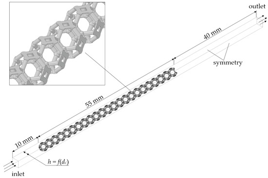 The conjugate problem of heat transfer in a structure created using Kelvin cells was solved in [12]. The research results showed that the thermal conductivity and strut size were critical parameters for heat transfer. One article [13] investigated the quantitative contribution of thermal radiation to heat transfer in heterogeneous catalysis. The authors concluded that, even for the cases of open-cell foam materials with a significant value of the thermal conductivity of the medium, neglecting the mechanism of thermal radiation can significantly change the process.