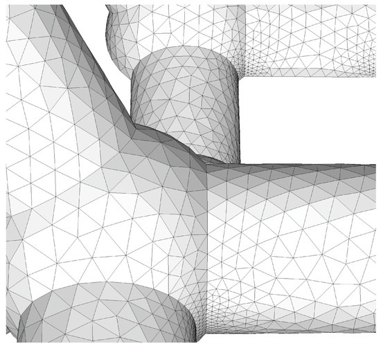 The final variant of the grid division obtained was 5.0 × 10−5 m, thickening up to 1.0 × 10−5 m on small surfaces. In the area of free gas flow, a grid with a mesh size of 1.0 × 10−4 m was constructed. A sample of the mesh on fibers is shown in Figure 6.