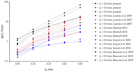 The results of calculating the pressure drop related to the length of the open-cell foam material are presented in Figure 8. Since, in the experiments and in our numerical simulation, studies were carried out only for one value of the velocity = 4.5 × 10−3 m/s, the results are presented depending on df. We see that our results are within the range of results for different correlations of other authors. In this case, for = 0.05 mm, our results are closer to the results of [37,51], and, for = 0.25 mm, our results are closer to the results of [51,52].