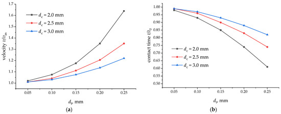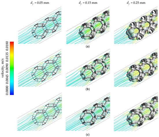 Figure 10a shows the graph of the average cross-sectional gas flow rate in a porous medium for all considered cases. The gas velocities shown are related to the velocity at the entry into the computational domain vin. At a value of df = 0.05 mm for all dc values, the porosity of the structure tended to 0.99, and the average velocity tended to the value of the velocity at the entrance to the computational domain. As the size df increased, the average gas velocity in the porous medium began to increase. The highest velocity value was observed in the case of dc = 2.0 mm and df = 0.25 mm and was .