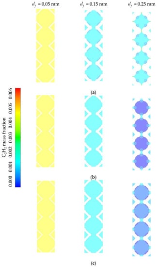 Additionally, the results from calculating the conversion and selectivity parameters were considered. Figure 11 shows the patterns of the fields of the mass content of acetylene in the longitudinal section of the computational domain for different options dc and df at = 45 °C. Significant differences are seen in the acetylene content with a change in the parameter df. At the same time, the differences when changing the parameter dc for the same df are insignificant.