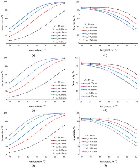 Results of conversion and selectivity calculation: (a) Conversion for = 2.0 mm. (b) Selectivity for dc = 2.0 mm. (c) Conversion for = 2.5 mm. (d) Selectivity for = 2.5 mm. (e) Conversion for = 3.0 mm. (f) Selectivity for = 3.0 mm.