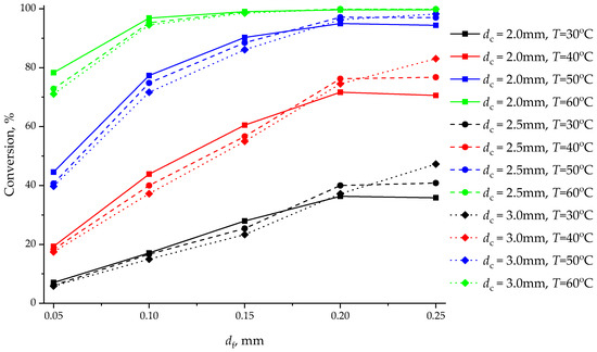 The results when choosing the temperature values 30, 40, 50, and 60 °C are shown in Figure 13. Significant differences in the nature of the curves can be noticed for gas temperatures of 30, 40, and 50 °C. Similar patterns are observed in the case of df = 0.05, 0.10, and 0.15 mm. The smallest conversion was observed for cases with dc = 3.0 mm, and the highest for cases with dc = 2.0 mm. The results differed significantly for df = 0.20 and 0.25 mm. For the variant = 0.25 mm, the smallest conversion was observed for cases with dc = 2.0 mm, and the highest was for cases with dc = 3.0 mm.