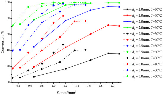 Figure 12 shows the graphs of the calculated conversion (Equation (3)) and selectivity (Equation (4)) for all studied variants of change , df, and . Clearly, an increase in conversion with the increasing temperature was observed. The smallest conversion was achieved for options = 0.05 mm. In this case, the porous medium had the smallest surface area, and 100% conversion was not achieved even at = 60 °C. It can be seen from the graphs that, at low temperatures (for example, for = 30 °C), the conversion for the case dc = 3.0 mm was greater than for the case = 2.0 mm.