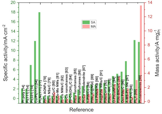 Figure 3 shows the mass activity for some selected HEAs for the ORR in acid and alkaline media, reported recently. Sun et al. developed, using a cooling-dealloying strategy, a senary high-entropy alloy for the ORR in acid media. The SA and MA (only considering the platinum mass) are 3.2 mA∙cm−2 and 2.24 A∙mg−1, respectively, and these values are 11 and 10 times higher than that of Pt/C. Moreover, the material retained 92.5% of his activity after 100,000 cycles [135]. In alkaline media, Li et al., using an alloying–dealloying strategy, produced an np-AlCuNiPtMn electrocatalyst which showed around 16-fold mass activity of the commercial Pt/C catalyst [136]. Other recently published works are included in the figure [137,138,139,140,141].