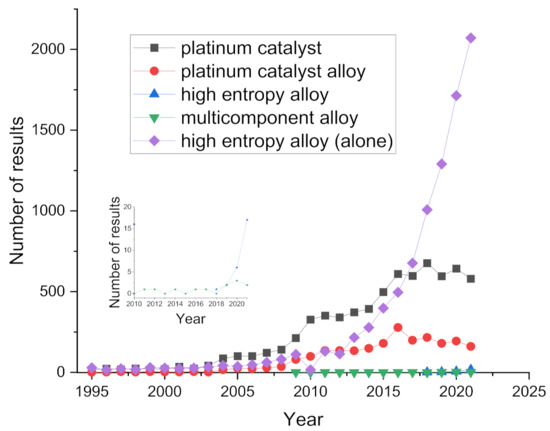 Multiple principal component and high-entropy alloys have gained a lot of attention due to their unique properties that bring the possibility to move from a using the materials we have approach to engineering the materials we need approach [111,112,113,114,115]. They have been investigated in electrocatalysis, as catalysts for ORR [116], carbon dioxide reduction reaction (CO2RR) [117,118], methanol oxidation [119], and hydrogen evolution reaction (HER) [120]. Figure 2 shows the number of publications on the database Scopus when the keywords “oxygen reduction” are used together with the listed phrases: “platinum catalyst”, “platinum catalyst alloy”, “high-entropy alloy”, or “multicomponent alloy” from 1995 to 2021. In the last 5 five years, “high-entropy alloy” experienced a similar exponential growth observed for “platinum catalyst” and “platinum catalyst alloy” around 2008.