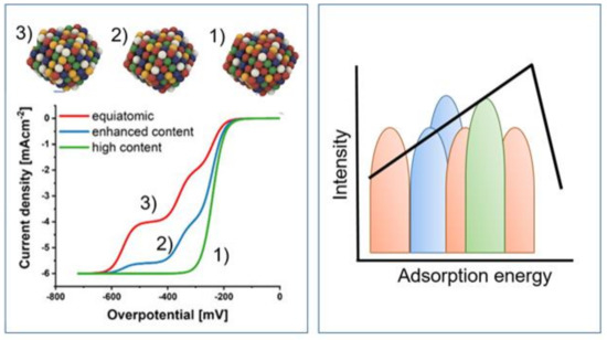 Left: Model representation of three different HEA with a high content of one element (1), enhanced content of one element (2), and equiatomic (3) compositions along with the polarization curves. Right: Adsorption energy distribution patterns for the three different materials (1), (2), and (3), respectively. Adapted with permission from [144]. Copyright © 2021, American Chemical Society.