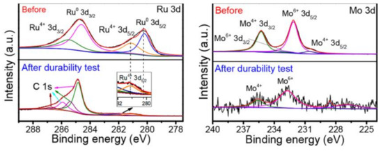 XPS spectra of Ru 3d and Mo 3d of the AlNiCoRuMo before and after durability test. Adapted with permission from [140]. Copyright © 2021, American Chemical Society.
