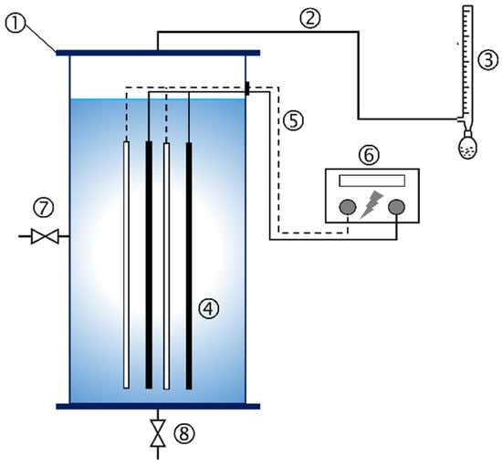 Experimental set-up in the batch column reactor: (1) column test, (2) gas collection pipe, (3) soap film meter, (4) electrode plates, (5) electrical wire, (6) DC generator, (7) sampling port, and (8) waste drainage port.