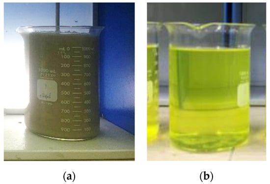 To synthesize turbidity and color wastewater, bentonite and reactive dye were prepared with tap water. For synthetic turbidity, bentonite was rapidly mixed with water at 300 rpm for 5 min, followed by slow mixing at 40 rpm for 30 min, and then we let it settle down for 35 min (see Figure 2a) [8]. Moreover, synthetically colored wastewater was prepared by dissolving the reactive dye in tap water for 5 min at 300 rpm (see Figure 2b) [8]. pH and TDS were measured using a pH meter (model Hanna HI 991300) and conductivity meter (model Lutron CD-4317SD), respectively. Chemical oxygen demand (COD) and total suspended solids (TSS) were analyzed following the Standard Methods of Examination of Water and Wastewater [9]. Table 1 shows the main parameters of the synthetic wastewater used in this study.