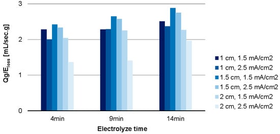 Qg/Eloss value at different electrolyze times (4–14 min), electrode gaps (1–2 cm), and current densities (1.5–2.5 mA/cm2).