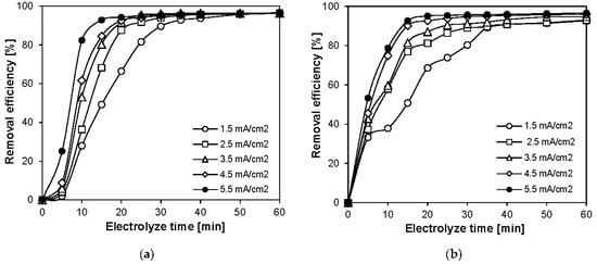 Current density plays an important role in the EC process. The cell current defines the rate of coagulant generation, bubble production rate and size, and distribution in the reactor with different electrode configurations [17]. The amount of coagulant is commonly increased when the current density is increased [18,19]. In this study, it was varied in five conditions, i.e., 1.5, 2.5, 3.5, 4.5 and 5.5 mA/cm2, for turbidity and color removal from wastewater for depth optimization. To evaluate the treatment performance in various EC operation conditions, the initial concentrations of turbidity and color were prepared for 250 NTU and 6000 ADMI, respectively. The results of turbidity and color removals with different current densities are shown in Figure 4. At the first stage, the greatest removal efficiency was achieved at a higher current density, 5.5 mA/cm2, for both turbidity and color removals, which is comparable with the study of Aoudj et al. (2010) [20]. However, at ≥20 min, the removal efficiencies are indistinguishable under current densities ≥2.5 mA/cm2 for turbidity and current densities ≥4.5 mA/cm2 for color removals. Therefore, the current density of 4.5 mA/cm2 was selected as the optimum condition for turbidity and color removal, while the steady stage operation time is about 20–30 min. Since this optimization was conducted under the constant initial condition, a kinetic study was then required in order to define the range of electrolyzing time at different initial concentrations.