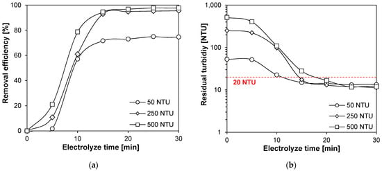 In order to achieve the targeted removal condition, kinetic studies of treatment procedures are required to determine removal performance in the operation of any reactor system. Moreover, it is important to understand the types of reaction rates in order to design a treatment unit. The change of reactant concentration per unit time is known as the reaction rate [21]. The initial concentrations of turbidity and color were varied from 50 to 500 NTU and 2500 to 15,000 ADMI, respectively. The results of turbidity removal are shown in Figure 5a,b. It should be noted that aquatic pH is another significant factor for this coagulation process [22]. The pH value in the cell increased with time from approximately 7.1–7.7 to 8.0–8.2 due to the hydrogen ion production during electrolysis. These pH values are in an effective range of the sweep floc coagulation mechanism, which is beneficial for the electrochemical process [23]. According to the results, after 30 min electrolysis, the residual turbidity was decreased to <20 NTU for all three conditions and <10 NTU if it was allowed to settle down for another 30 min. Furthermore, the lag stage for the low concentration (50 NTU) was longer than that of higher concentrations (≥250 NTU) (see Figure 5a). The 50 NTU needed about 25 min of electrolyzing time to dissolve the aluminum ion into a cell and reach a stable stage, which provided a removal efficiency of around 75%. For higher turbid conditions, 250 NTU and 500 NTU required about 20 min to achieve 96% and 98% removal efficiency, respectively. In addition, 15 min are required to remove turbidity from 50 and 250 NTU to lower than 20 NTU and 20 min for 500 NTU (see Figure 5b).