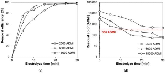 For color, it required more electrolyze and treatment time for the molecule or colloid to attach to a coagulant to precipitate, which is followed by the sweep flocculation mechanism [11]. After precipitation, it will be captured by Al(OH)3 or polymeric aluminum hydroxide flocs before floating to a gel state [24]. Figure 5c,d shows the color removal kinetics. At 20 min, a 95% removal efficiency was achieved for the investigated color conditions. However, under the highest color level (15,000 ADMI), the reactive stage period required a longer time by about 5 min compared to the lower color level (2500–6000 ADMI), ranging from 15 to 20 min of electrolyzing time. This condition might require more aluminum coagulant and, consequently, need a longer time for dissolving ions and the reaction. However, there is no significant effect on the decolorization performance after reaching the steady state at 20 min (see Figure 5c). A similar trend was also found by Kobya et al., 2011 [25]. In terms of residual color, 56, 34, and 435 ADMI were measured after 30 min of EC operation for initial color levels of 2500, 6000, and 15,000 ADMI, respectively. However, in order to remove the highest initial color level (15,000 ADMI) until it was lower than 300 ADMI, Thailand’s effluent standard of color, a treatment time of up to 60 min is required (data not shown). Based on the aquatic pH level of the wastewater, it changed from 7.1–7.3 to 8.1–8.5 before and after conducting the experiments, which is a proper condition for destabilization mechanisms, as reported in a previous study [26]. Overall, it can be noted that a faster removal efficiency was obtained for a higher initial concentration for turbidity, which is in contrast to color, where a faster removal efficiency was achieved for a lower initial concentration.