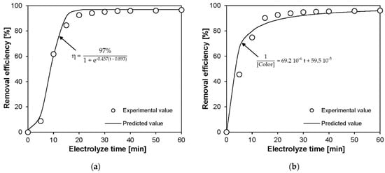 For turbidity removal, the sigmoid curve correlation was fitted as expressed in Figure 3, where η and t are removal efficiency (%) and electrolyze time (min), respectively. After fitting the experimental results, the variables achieved are ηstable ≈ 97%, k ≈ 0.085 CD + 0.075, and t50 ≈ −2.081 CD + 18.168, where k is sigmoid steepness (min−1) and CD is current density (mA/cm2). In addition, the second-order correlation of decolorization, (1/[Color]) = kt + (1/[Color]0) was fitted from the experimental results, where [Color] and t are the level of color (ADMI) and electrolyze time (min), respectively. The kinetic constant, k (as ADMI−1 min−1), was empirically constructed in terms of current density (CD as mA/cm2), k ≈ (1.1CD + 1.95) 10−5. In order to evaluate the prediction performance of the constructed correlations, the experimental and predicted results of turbidity and color removal under 4.5 mA/cm2, the optimum condition previously found, were plotted in Figure 6. It can be observed that the predicted values were in good agreement with the experimental results. The constructed correlations for turbidity and color under the operation of 4.5 mA/cm2 current density are also shown in Figure 6a,b, respectively.