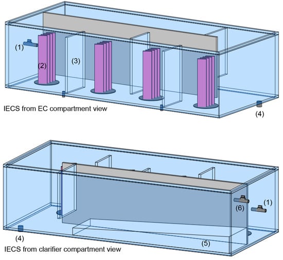 Three-dimensional drawing of IECS: (1) inlet port, (2) electrode set, (3) compartment baffle, (4) de-sludge port, (5) bottom slop of clarifier compartment, and (6) outlet port.