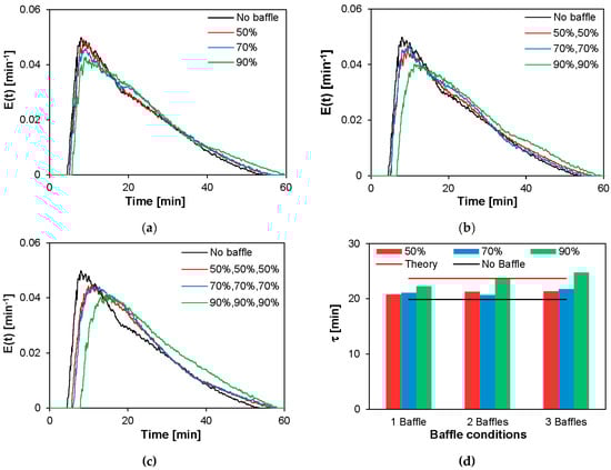 For every condition, E(t) curves showed a trend similar to a plug flow reactor model. The E(t) function (see Figure 9a) indicated that when even a single baffle was added with different lengths, the performance was not much different from the non-additional case. There is also no significant difference for 50% and 70% widths for two baffles added, while a 90% condition provided a longer retention time (see Figure 9b). In the case of three baffles used, 90% width showed the longest hydraulic retention time, followed by 50% and 70%, compared to no added baffles (see Figure 9c). Figure 9d illustrates the mean time distribution of different conditions compared to the non-additional and theoretical conditions. Adding baffles(s) showed an improvement in the mean time, regardless of the baffle’s length. Moreover, a comparable performance was observed after installing 50% and 70% baffles. However, the 90% case provided a significantly longer retention time compared to 50–70% and no baffle addition. In conclusion, three baffles with 90% width resulted in better mixing by reducing the bypass mechanism. This condition was then selected for the IECS reactor in order to reduce the bypass and dead zone in the system.
