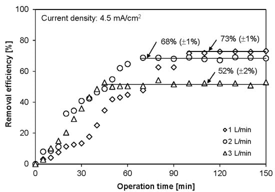 In continuous operation, the liquid flow rate is important to examine. Therefore, the color removal using the IECS reactor under the optimum condition found was tested by varying the liquid flow from 1 to 3 L/min. The results are plotted in Figure 10, where two zones, reactive and steady stages, were clearly separated. Based on the removal efficiency trends, liquid flows of 1, 2 and 3 L/min reached the steady stage at different times, i.e., approximately 100, 70 and 45 min, respectively. The reactive stage observed in this continuous mode is due to the reactor’s first start-up before operating. However, the treatment performance at the steady stage was evaluated and analyzed. On average, 1, 2 and 3 L/min resulted in color removal efficiencies of 73 ± 1%, 68 ± 1%, and 52 ± 2%, respectively (see Figure 10) [15]. From this result, the treatment performance of IECS is lower than that of a batch reactor by about 20–40%. In terms of electrolyzing time, it should be sufficiently compared to the batch results. A low dissolution rate and slow mixing might be the reasons for the limited precipitation rate as well as the lower decolorization efficiency. A batch column has a smaller cross-sectional area than each EC unit in the IECS reactor, providing better mixing characteristics and benefitting the coagulation reaction more than an integrated reactor. To enhance the removal efficiency reaching the target level, the current density should be increased to provide higher coagulants and a higher precipitation rate.