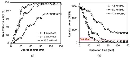 Color removal at different current densities: (a) removal efficiency, and (b) residual color.